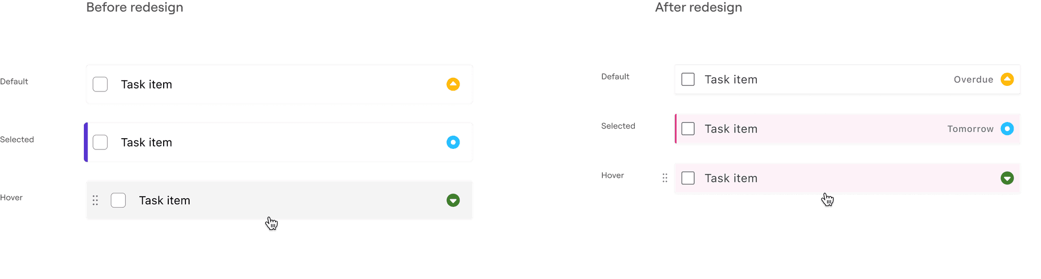 Task items were redesigned to accommodate our current and future integrations. We decreased padding for increased list item density, and moved the domino grabber outside to avoid moving the checkbox click target.