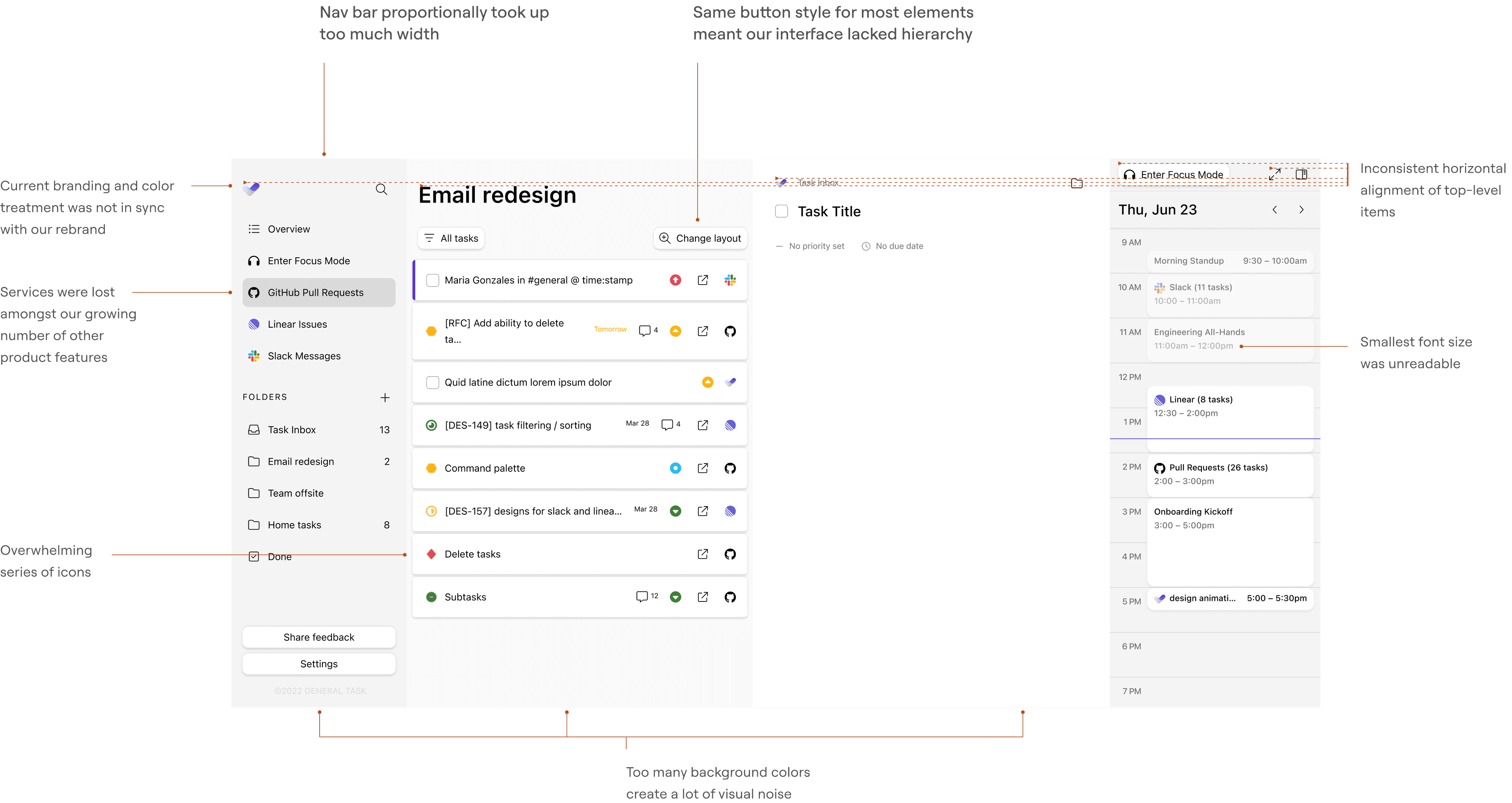 General Task's UI suffered from inconsistencies, both visually and functionally. We were missing foundational interaction states and had inconsistent components across the app that led to an overall clunky user experience. These were definitely red flags which decreased the quality bar of our app.
