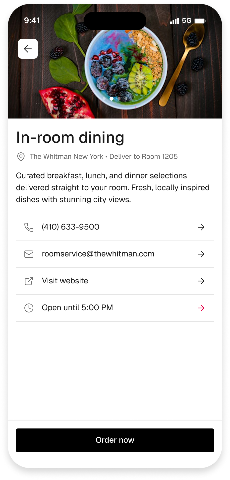 Guests land directly on the restaurant's menu, not a hotel info page. I prioritized showing food immediately because research showed guests arrive with intent to order — removing friction between “I'm hungry” and “here's what's available” was the biggest conversion lever.