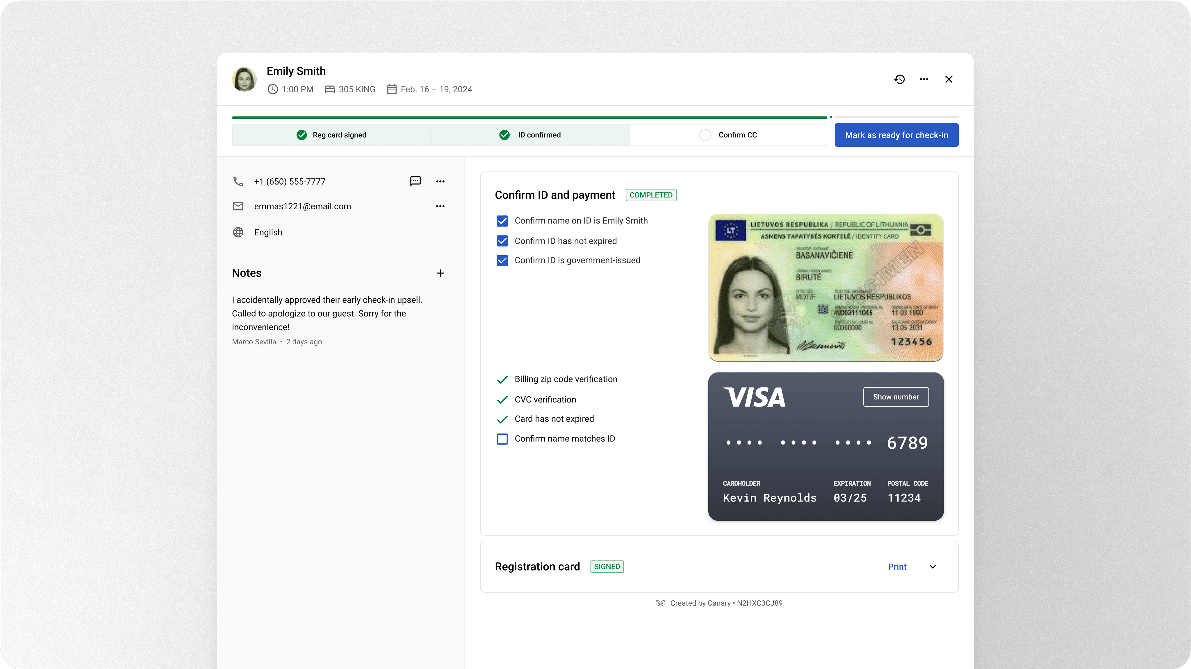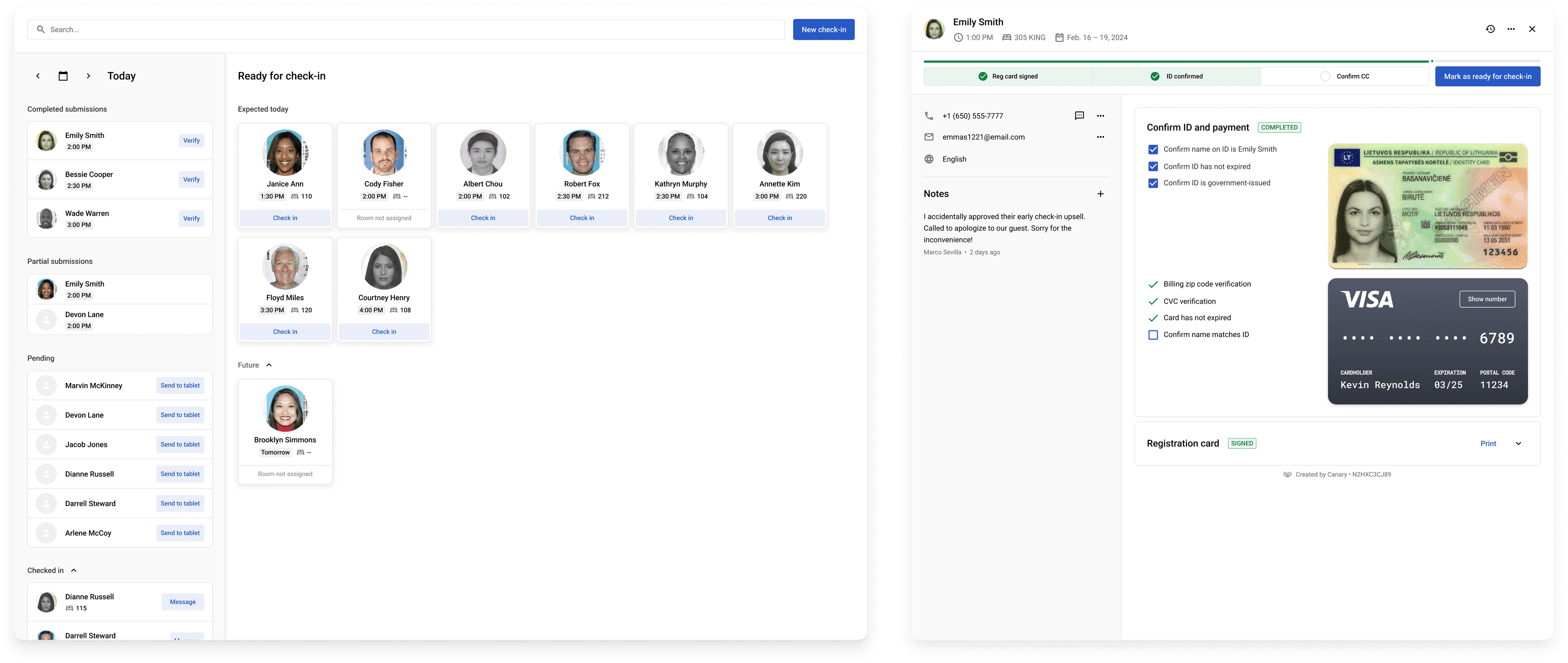Guest check-in details was designed in alignment with hotel staff operational workflow. We designed wanted to translate the traditional analog process of comparing the guest payment card and ID card by placing those documents side-by-side.